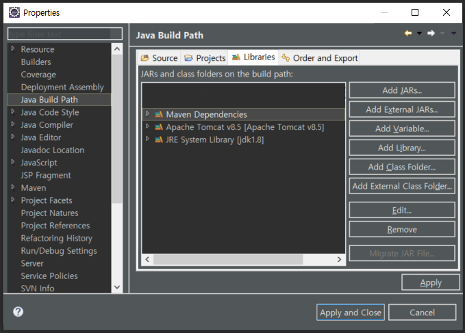Project 우클릭 ➡ Properties ➡ Java Build Path ➡ Libraries ➡ Maven Dependencies X