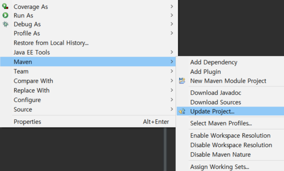 1. Project 우클릭 ➡ Maven ➡ Update Project (Alt + F5)