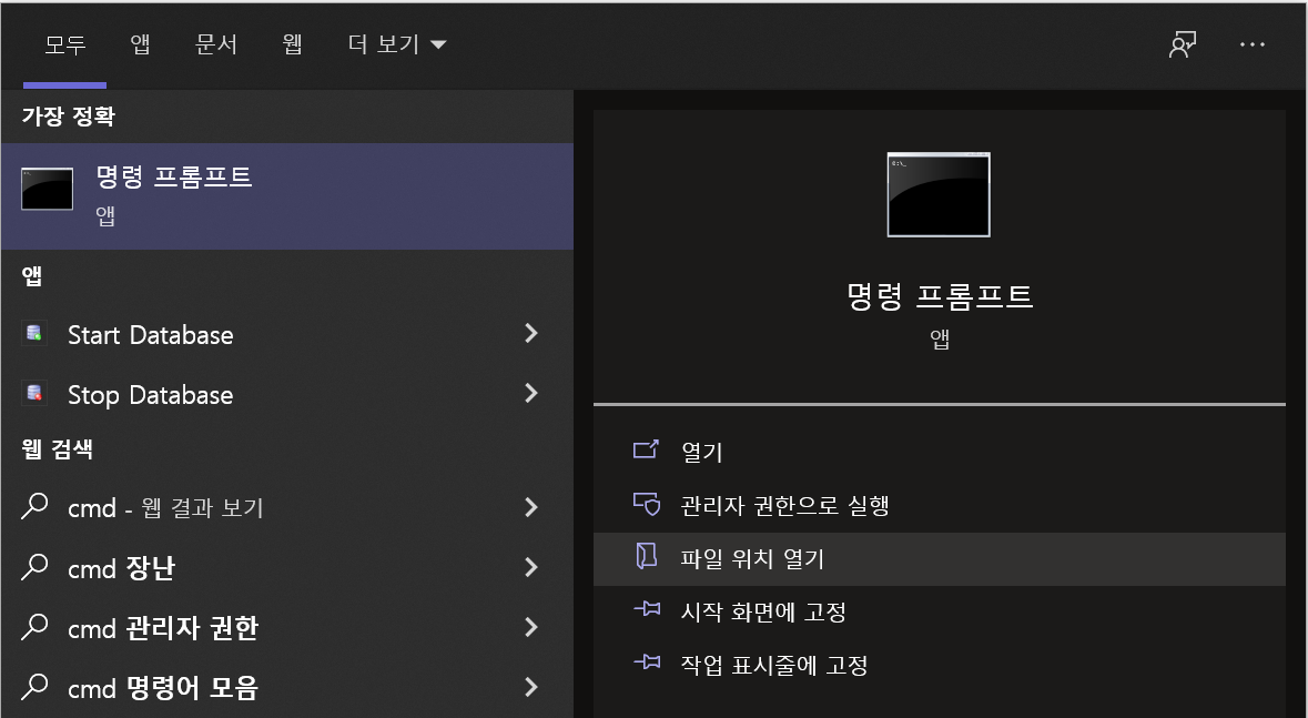 ➡ 명령 프롬프트 ➡ 파일 위치 열기 클릭