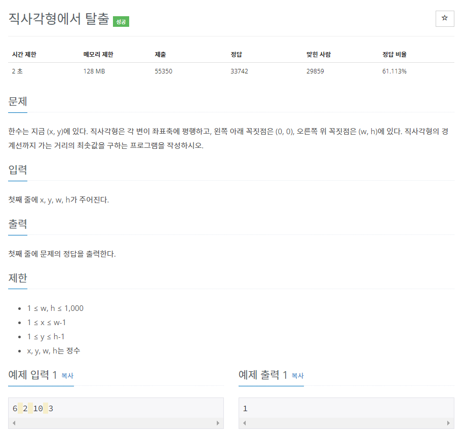 한수는 지금 (x, y)에 있다. 직사각형은 각 변이 좌표축에 평행하고, 왼쪽 아래 꼭짓점은 (0, 0), 오른쪽 위 꼭짓점은 (w, h)에 있다. 직사각형의 경계선까지 가는 거리의 최솟값을 구하는 프로그램