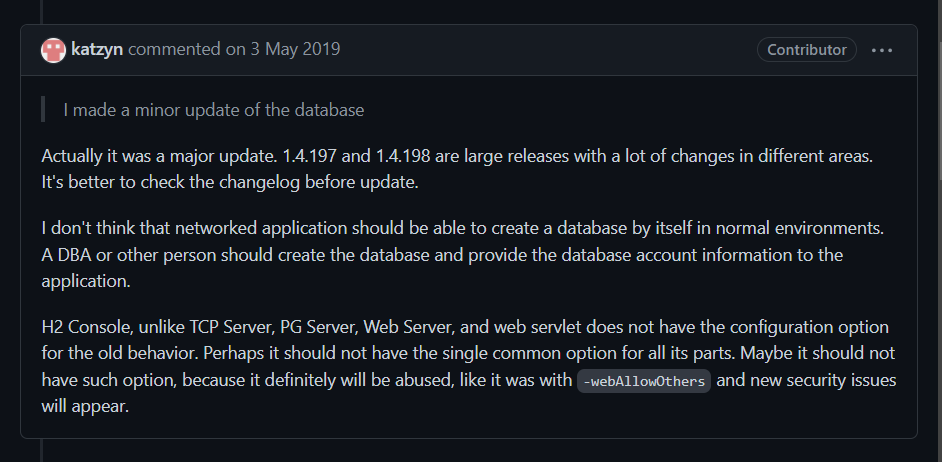 h2 버전 중 1.4.197 과 1.4.198 사이에서 대규모 업데이트 진행