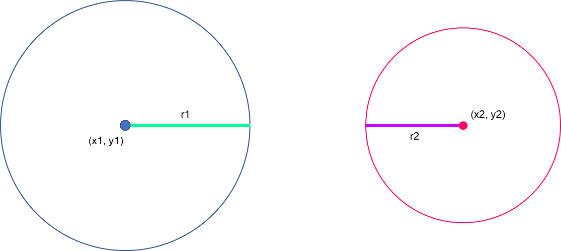 - ( (𝑥₂ - 𝑥₁)² + (𝑦₂ - 𝑦₁)² )½ > 𝑟₁ + 𝑟₂ ➡ (𝑥₂ - 𝑥₁)² + (𝑦₂ - 𝑦₁)² > (𝑟₁ + 𝑟₂)²
