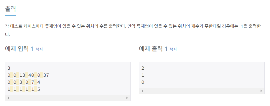 각 테스트 케이스마다 류재명이 있을 수 있는 위치의 수를 출력한다. 만약 류재명이 있을 수 있는 위치의 개수가 무한대일 경우에는 -1을 출력한다.