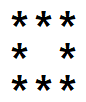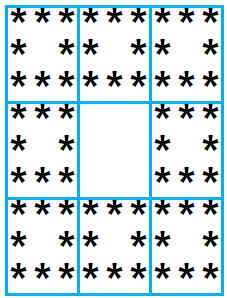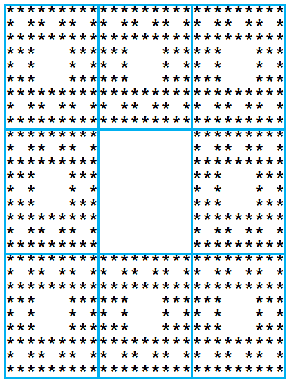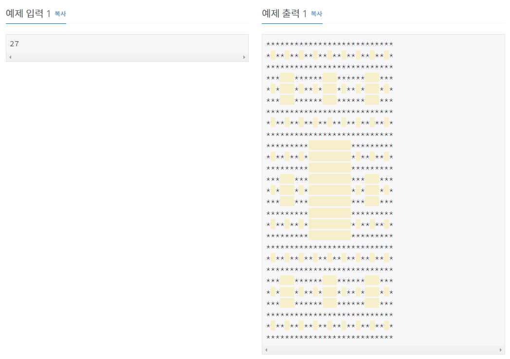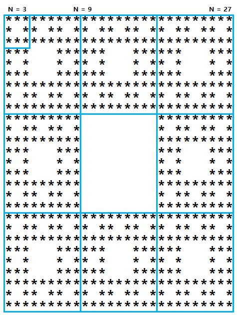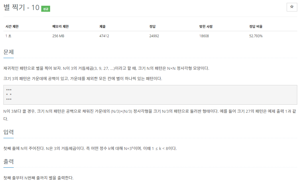 재귀적인 패턴으로 별을 찍어 보자. N이 3의 거듭제곱(3, 9, 27, ...)이라고 할 때, 크기 N의 패턴은 N×N 정사각형 모양이다. 크기 3의 패턴은 가운데에 공백이 있고, 가운데를 제외한 모든 칸에 별이