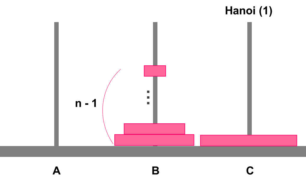 - 이전 단계에서 A에서 B로 (n - 1)개 이동하듯, B에서 C로 이동하는 횟수는 Hanoi (n - 1)이 됨