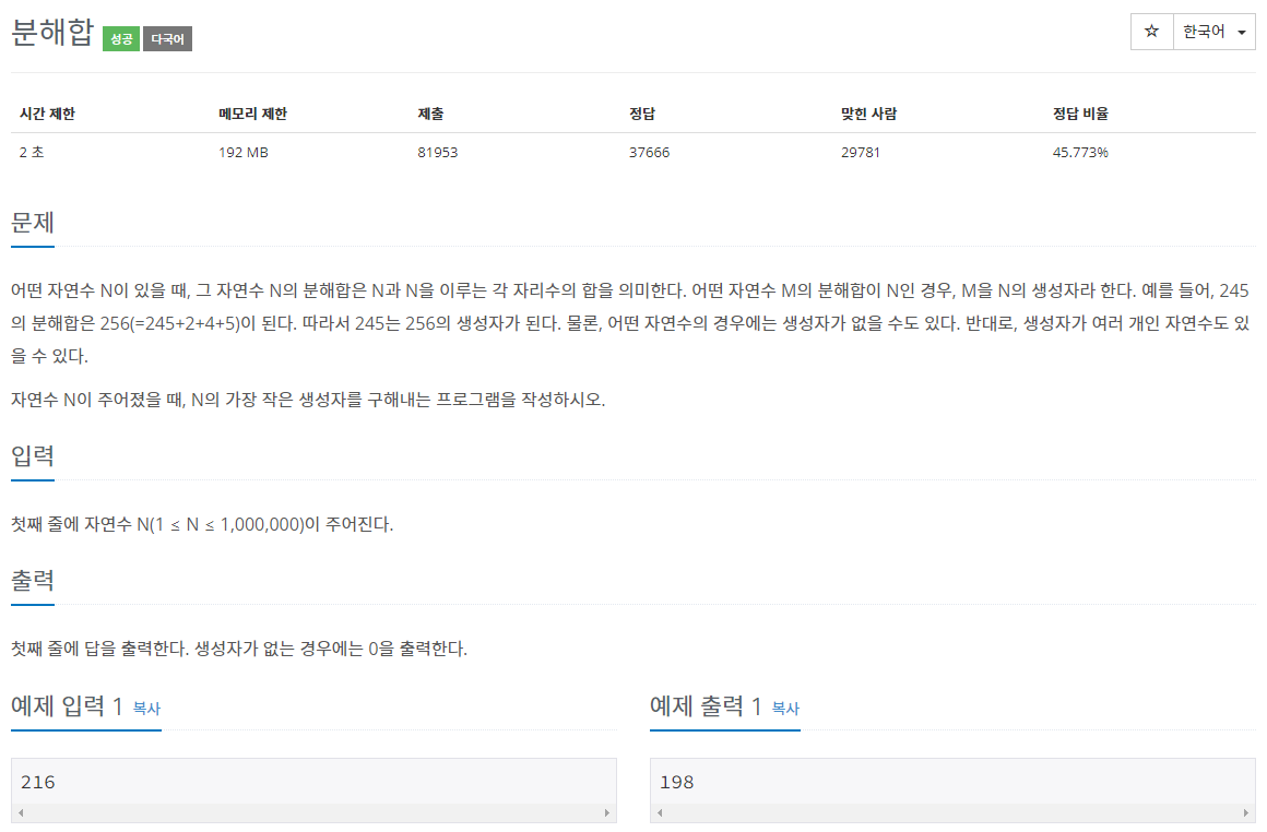 어떤 자연수 N이 있을 때, 그 자연수 N의 분해합은 N과 N을 이루는 각 자리수의 합을 의미한다. 어떤 자연수 M의 분해합이 N인 경우, M을 N의 생성자라 한다. 예를 들어, 245의 분해합은 256(=245+2+4+5)이