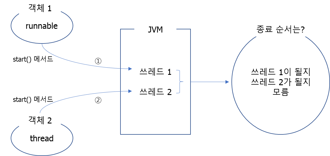이때 시작한 start() 메서드가 끝날 때까지 기다리지 않고, 그 다음 줄에 있는 thread라는 객체의 start() 메서드 실행