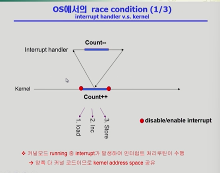 - A가 본인 코드 실행하다 시스템콜로 커널에 요청해서 커널이 count ++ 작업 진행하던 도중, 이 프로세스에 할당된 시간이 끝남(count++ 가 끝나지 않은 것)