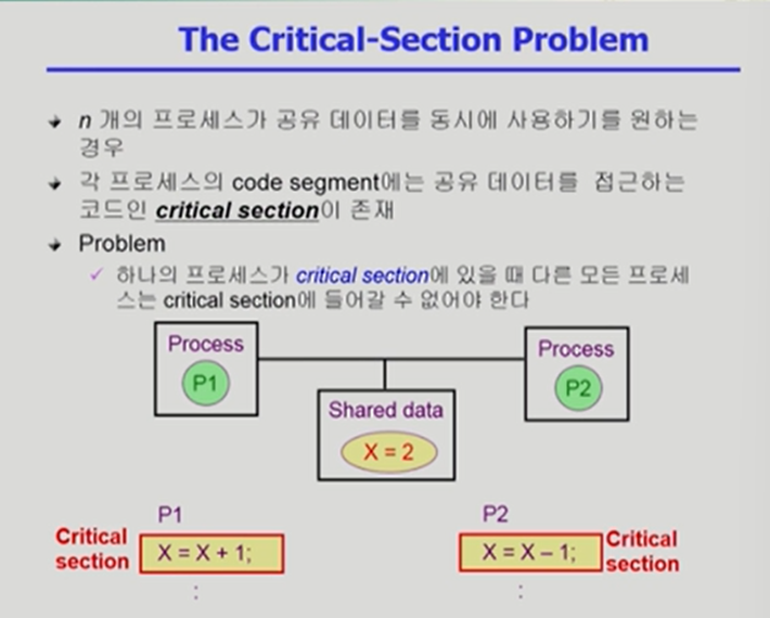 - CPU를 뺏겨서 다른 프로세스에 CPU가 넘겨지더라도 공유 데이터에 접근하는 것은 불가하게 해야