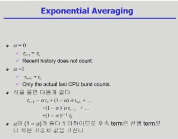- 예측시간 = n 번째 실제 CPU 사용 시간과 n 번째 예측했던 CPU 사용시간을 일정 비율 곱해 사용