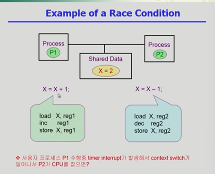 - 여러 주체가 하나의 데이터에 동시 접근 시 race condition (경쟁 상태)