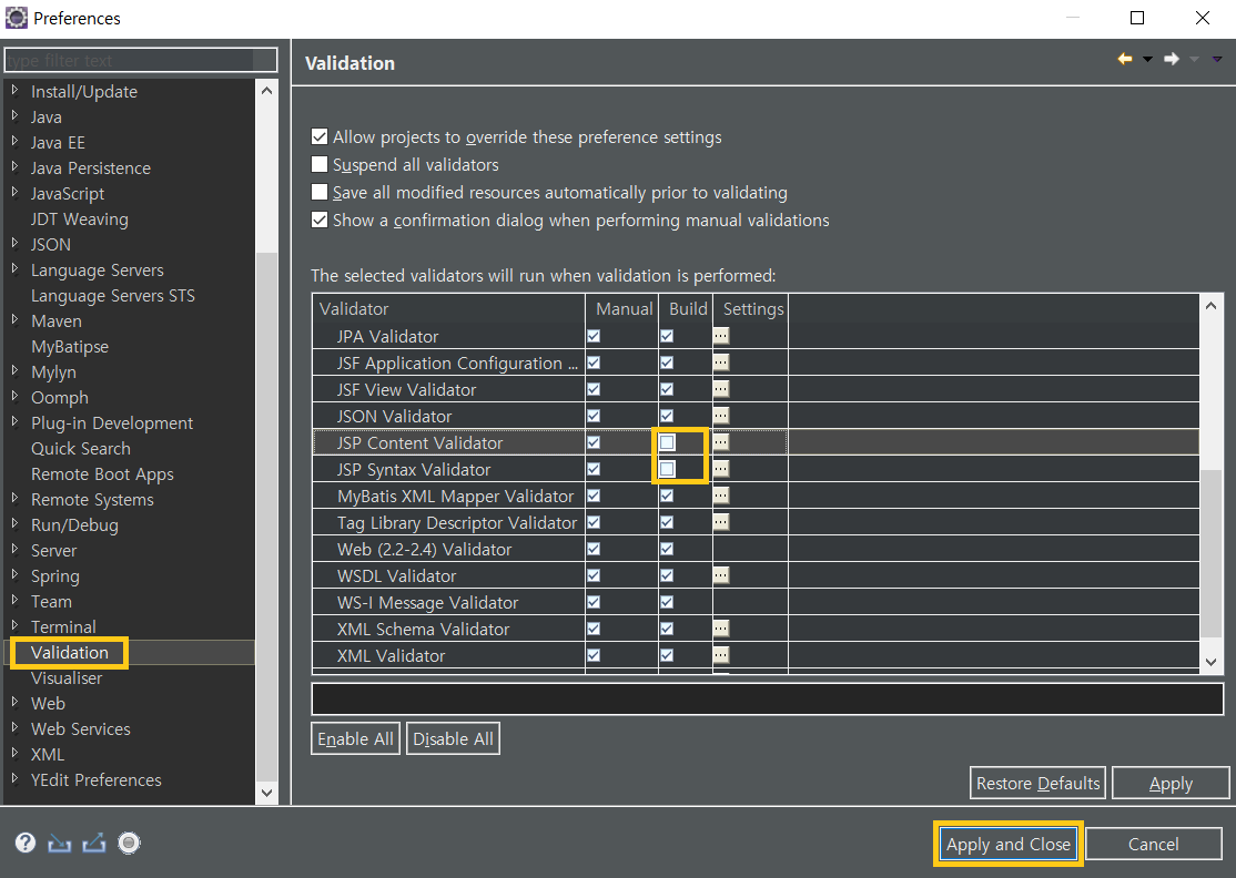 ➡ 유효성 확인 불필요한 부분의 Build 체크 해제(JSP만 해제함)