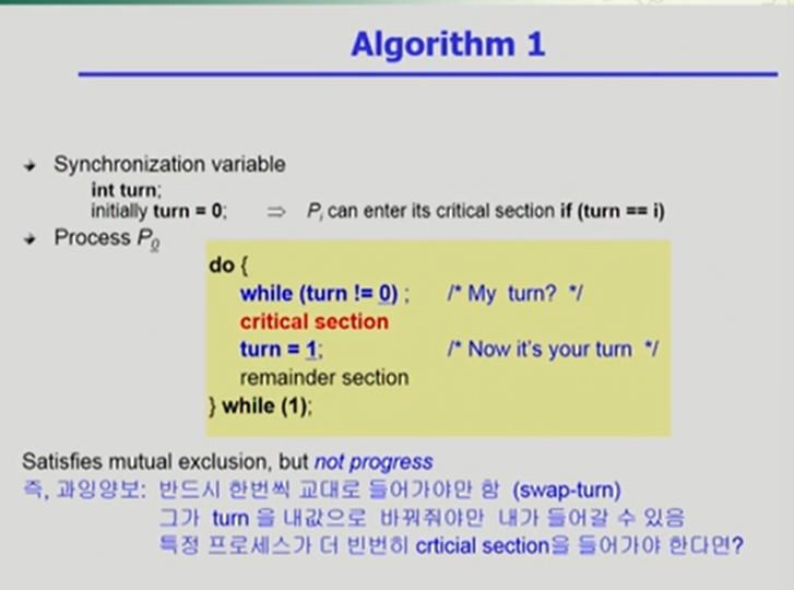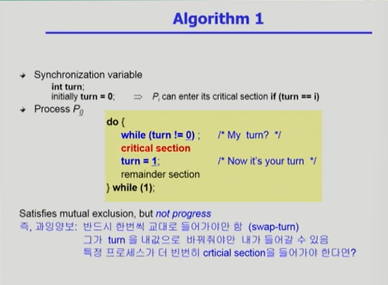 - 프로세스 a 도 상대방인 프로세스 b 가 더 안 들어가서 turn 을 바꿔주지 않기 때문에 영원히 들어갈 수 없음