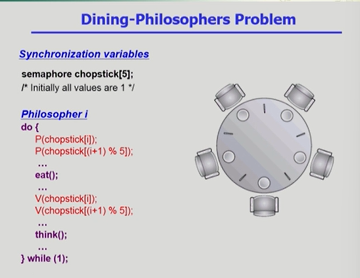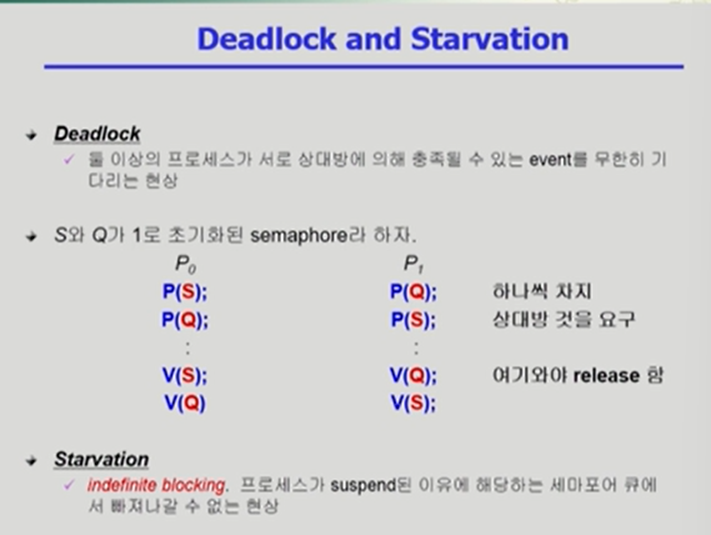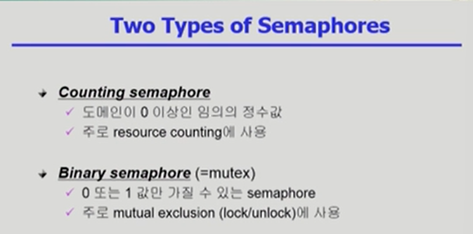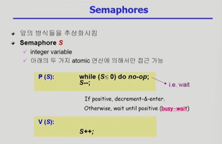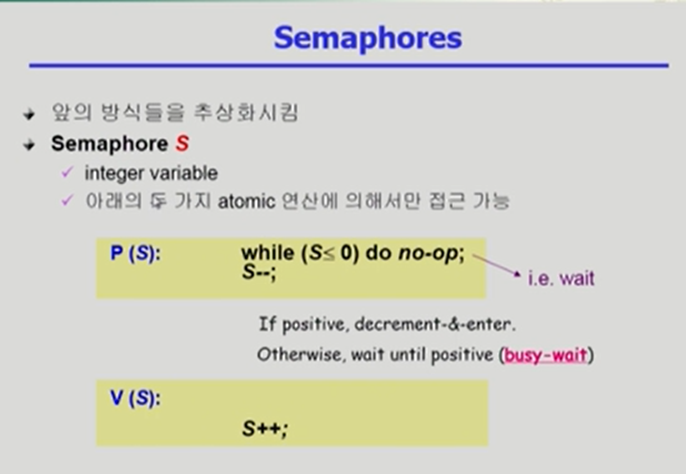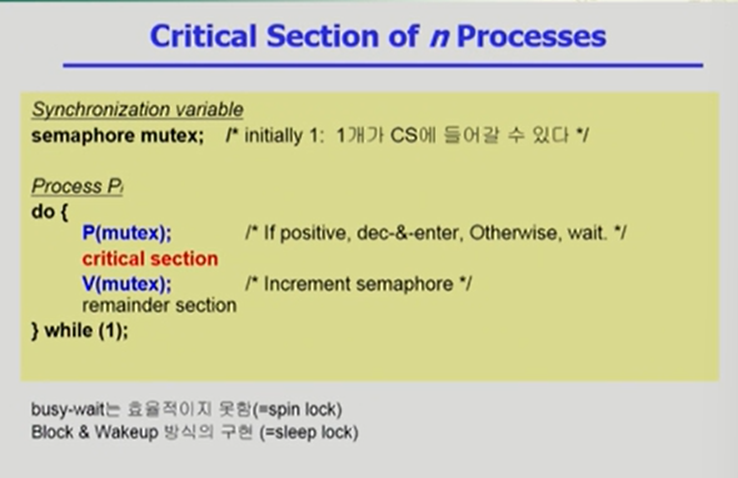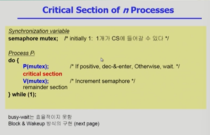 - P 연산 = while 돌면서 CPU 계속 소비하면서 대기하는, busy-wait 발생 가능성 있음(자원 낭비)
