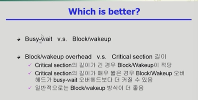 - Critical section 길이가 짧으면 busy-wait 가 효율적일 수도 있음