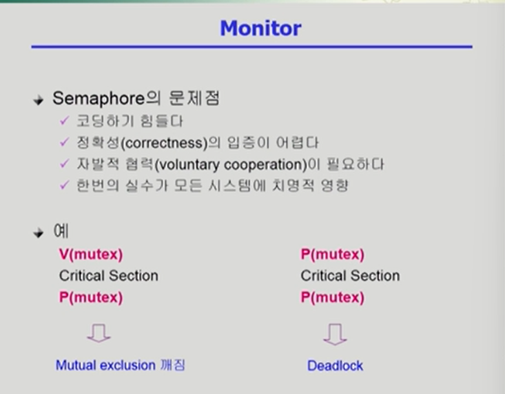 - 모니터가 알아서 하나의 프로세스만 모니터에 접근할 수 있게 통제함