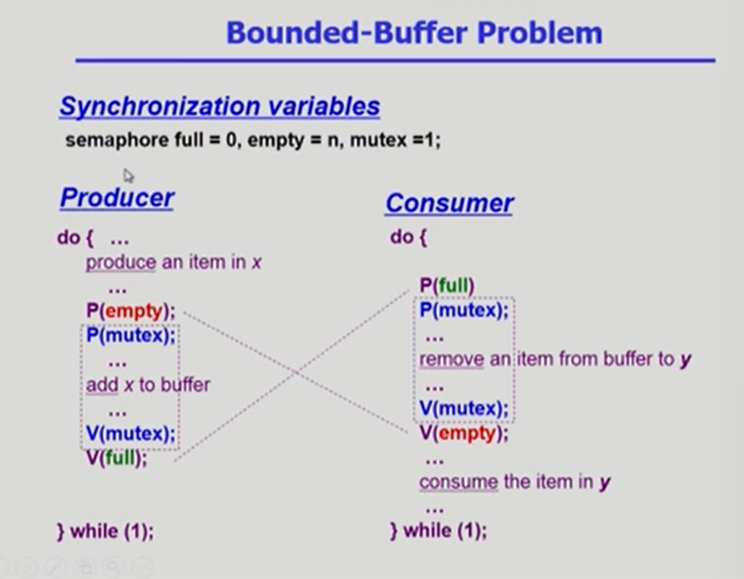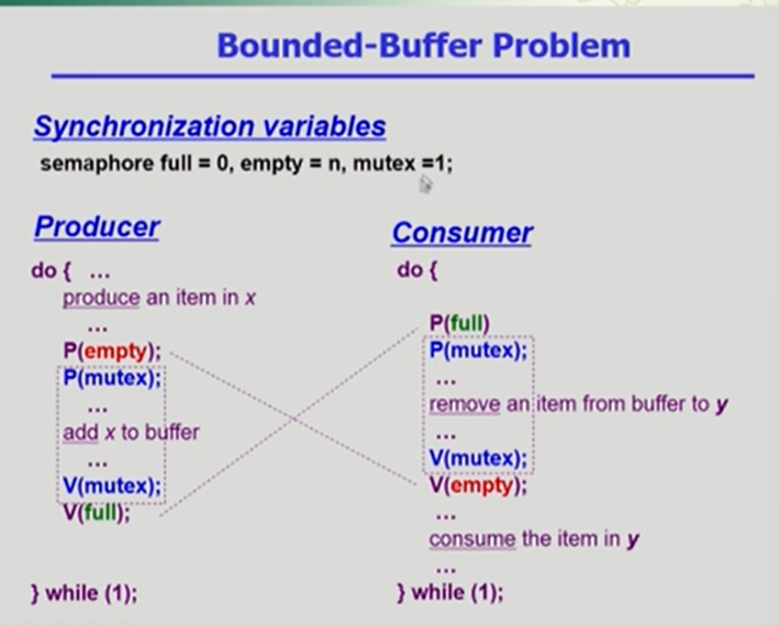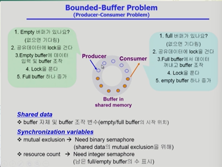 - P(full) = 내용이 들어 있는 버퍼가 있다면(생산자가 데이터 하나 만들어서 버퍼에 넣고, 내용 있는 버퍼 개수 + 1 될 때까지 기다림)
