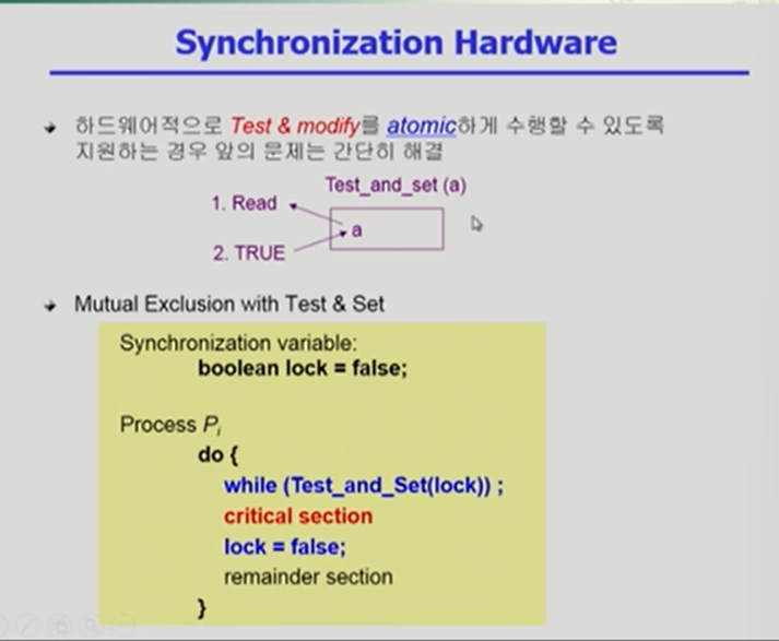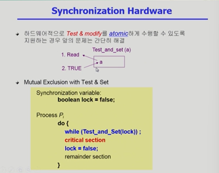 - Test and set instruction 실행하면 Peterson’s algorithm 처럼 복잡할 필요 없음