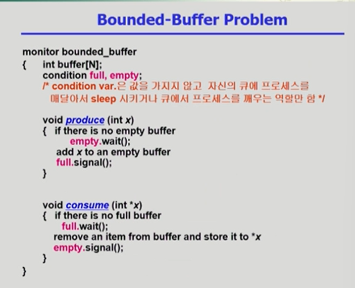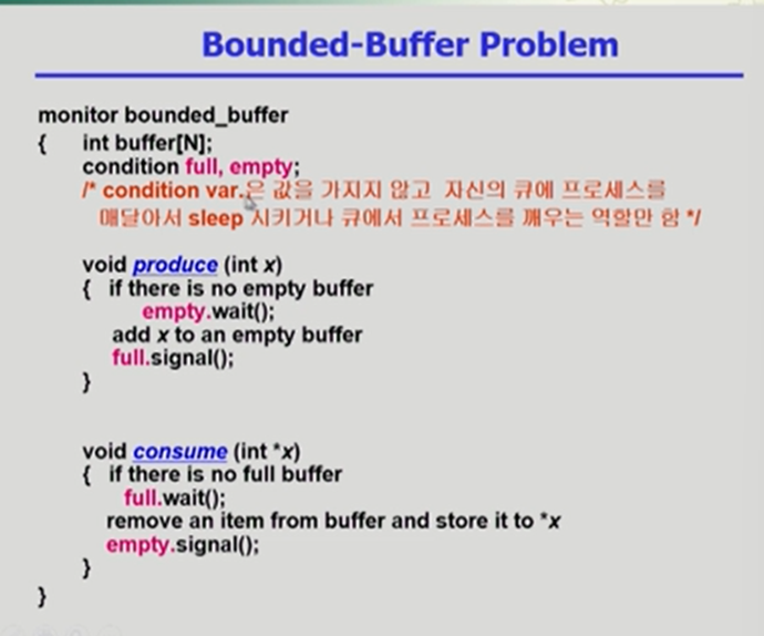- 공유 버퍼가 모니터 안에 정의되어 있어서, 생성자 / 소비자 들 중 하나의 프로세스만 모니터 내부에서 활성화됨