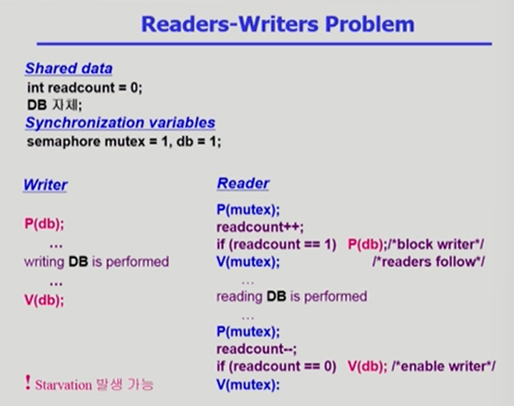 - 다른 reader들이 우르르 들어온다면 writer는 모든 reader가 끝날 때까지 계속 기다려야 함 = starvation