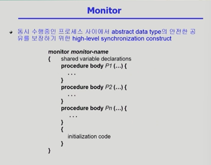 - 내부의 procedure를 통해서만 공유 데이터 개념에 접근할 수 있게 모니터 내부에 공유 변수 선언 후(= shared variable declarations),