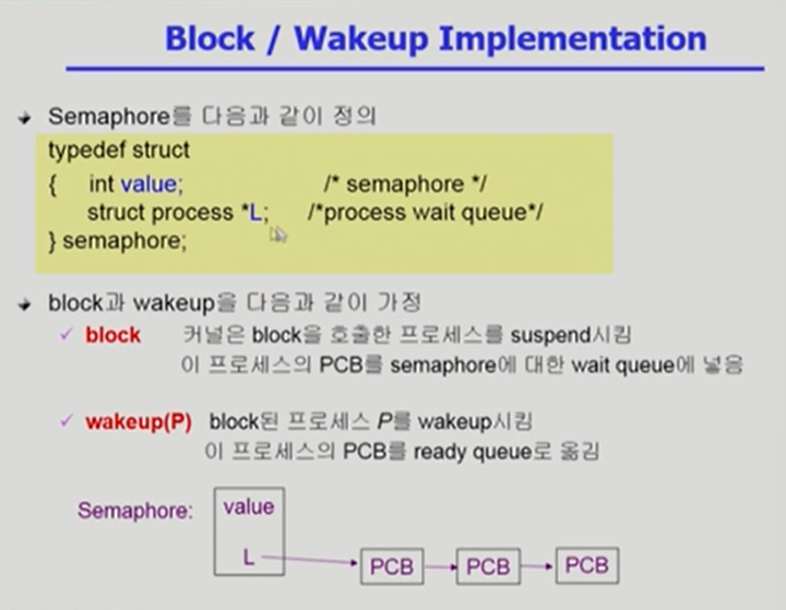 - Semaphore 를 기다리며 잠들어 있는 프로세스들의 PCB를 semaphore 변수 큐에 줄줄이 연결시킴