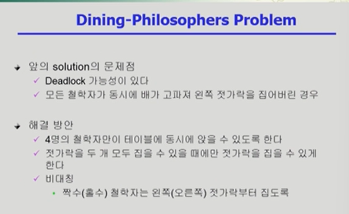 - 이 소스는 deadlock 위험이 있음(모든 철학자가 동시에 배가 고파져 왼쪽 젓가락을 집어버리면 아무도 먹을 수 없음)