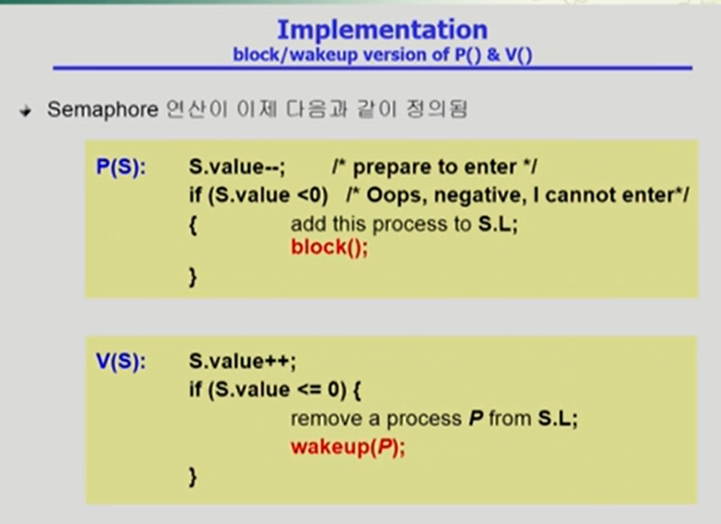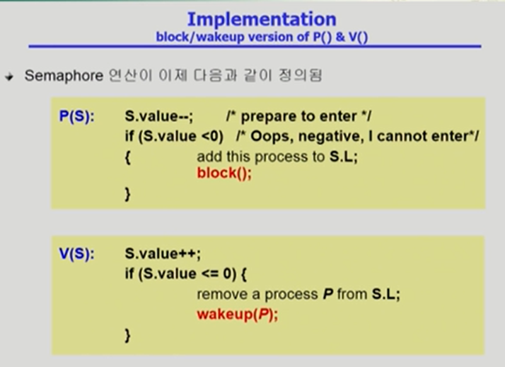 - 지금 semaphore 획득 못하면 그 프로세스를 block 시키고