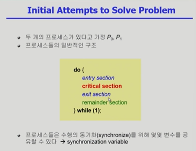 - 공유 데이터에 접근하기 전, entry section 만들어서 lock 걸고