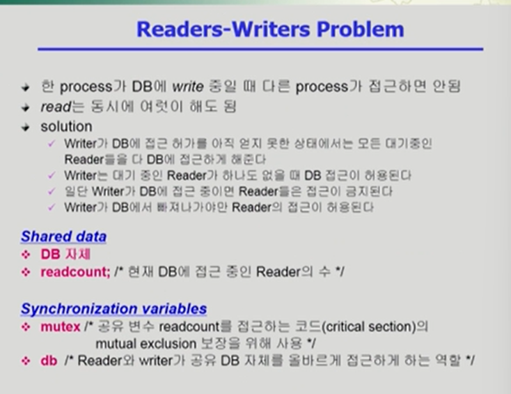 - Readcount라는 변수에 대해 락을 걸 땐 mute라는 binary semaphore 사용