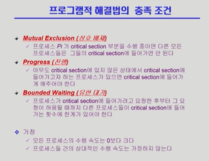- Progress는 위 문제 발생하지 않도록, critical section이 비어있을 때 한 프로세스가 사용할 수 있게 해줌