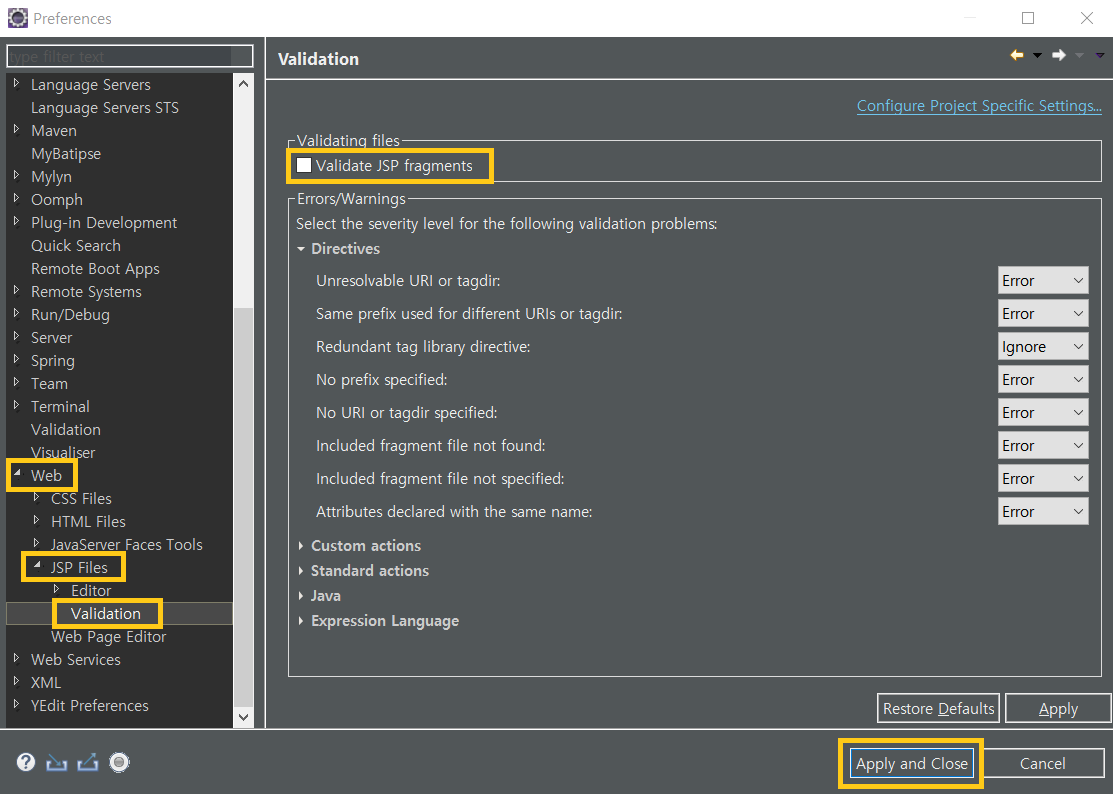 ➡ 유효성 확인 불필요한 부분의 Build 체크 해제(JSP만 해제함)