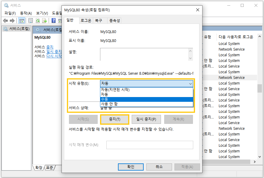 - 윈도우 부팅 시 MySQL 자동 실행을 중지시키려면: 시작 유형의 [자동]을 [수동]으로 변경