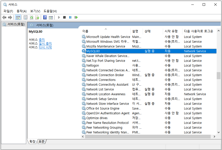- MySQL 동작 안 할 때: 해당 서비스가 [실행 중]인지 확인