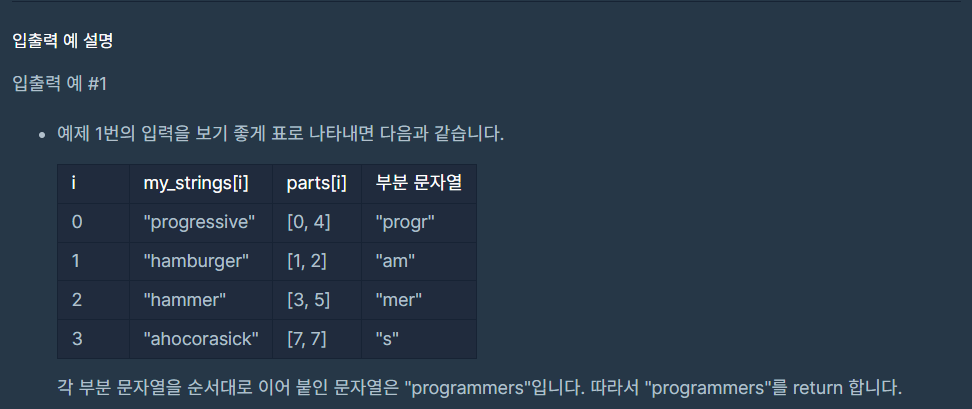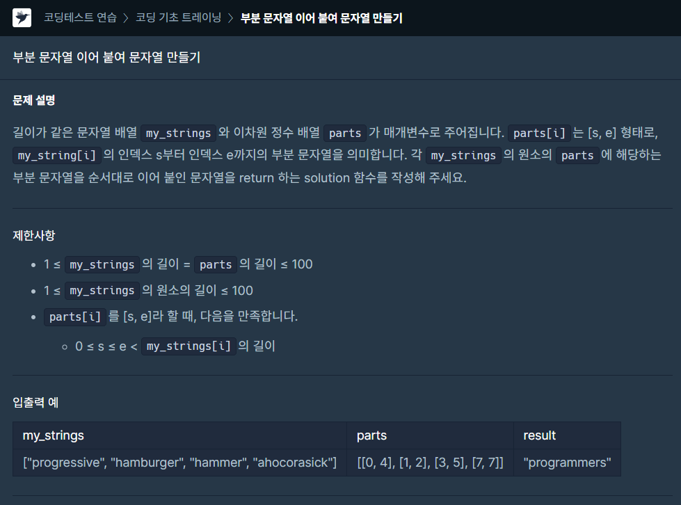 public String solution(String[] myStrings, int[][] parts) {