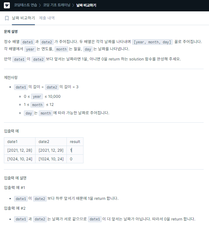 return Arrays.compare(date1, date2) < 0 ? 1 : 0;