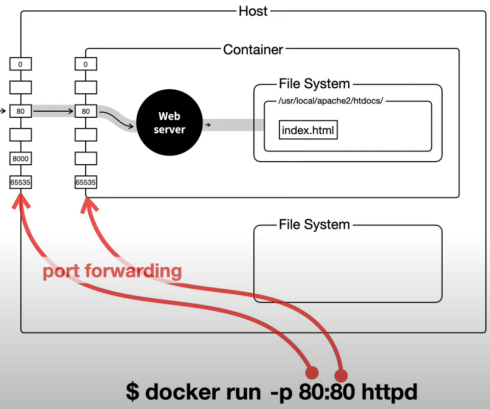 - 하나의 도커 호스트에는 여러 개의 컨테이너가 만들어질 수 있고 독립적으로 실행되기에, 개별의 포트와 파일 시스템을 가짐