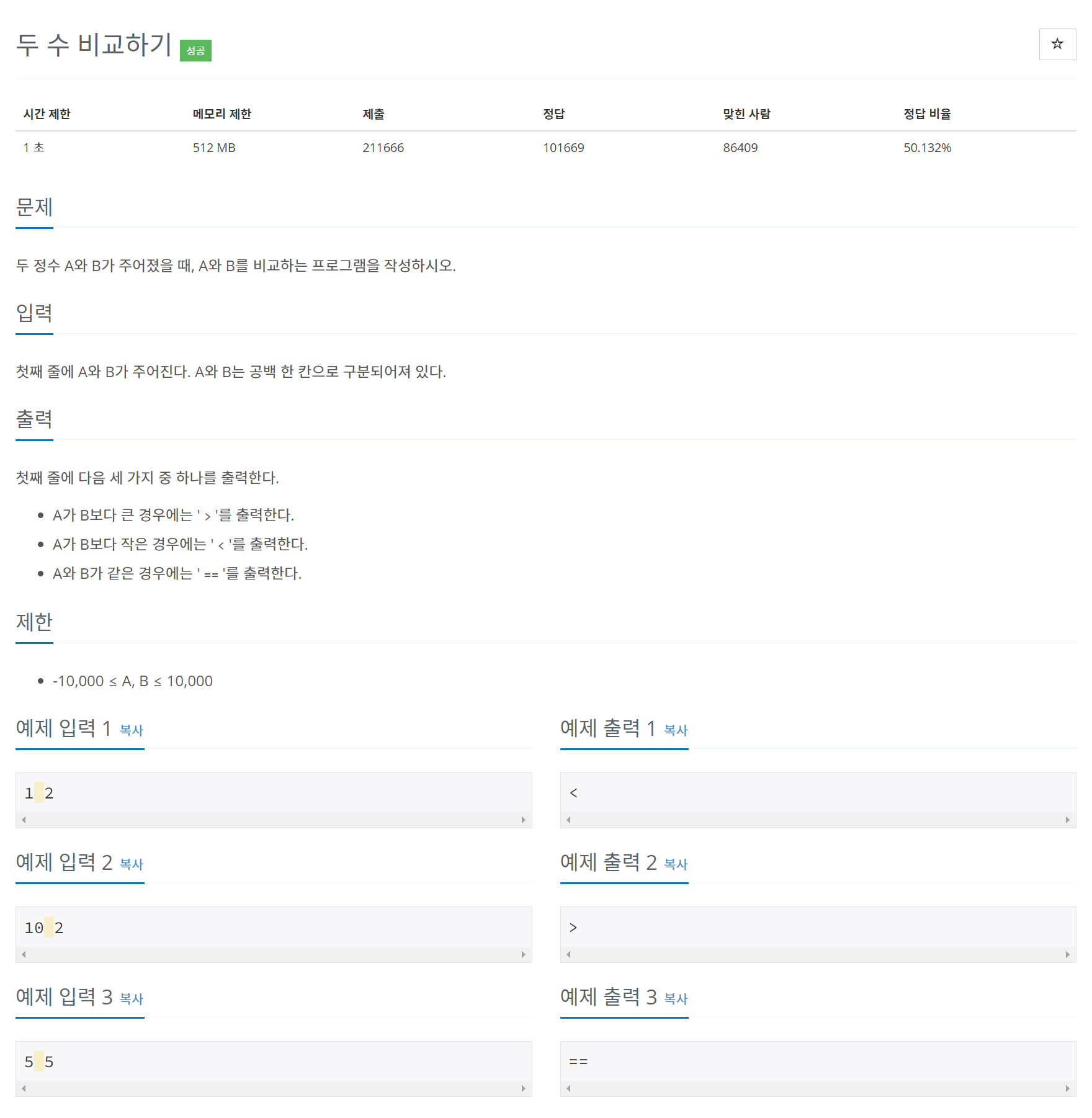 두 정수 A와 B가 주어졌을 때, A와 B를 비교하는 프로그램을 작성하시오.