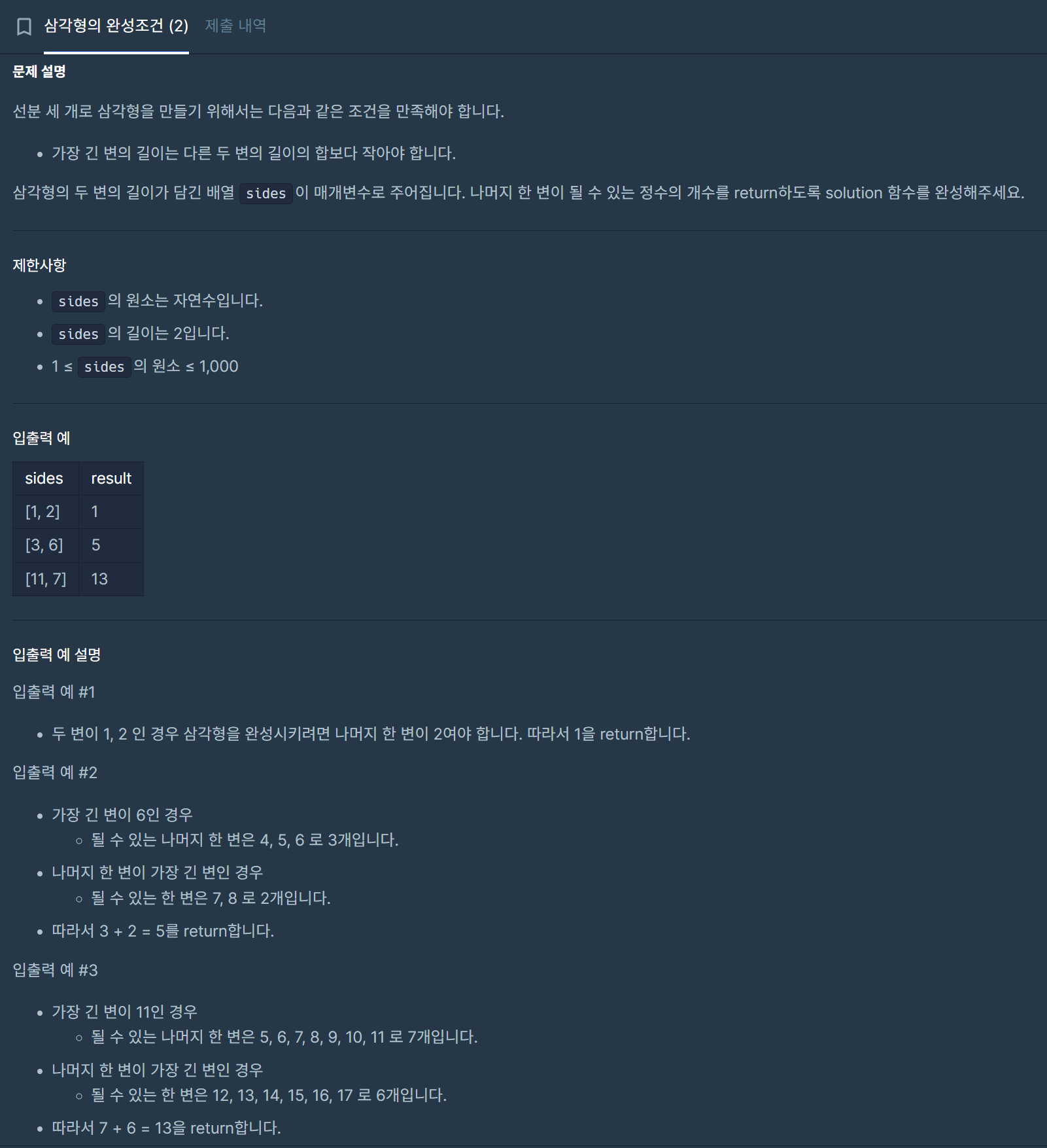 이 범위 안에 있는 정수 개수를 구하면, 삼각형을 만들 수 있는 모든 경우의 수를 알 수 있다.
