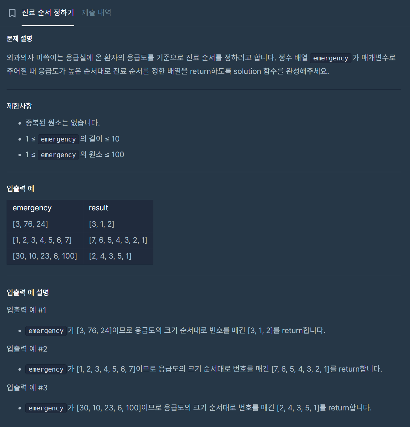 | i | emergency[i] | sorted[j] | j | 순위 (3 - j) | answer[i] |
