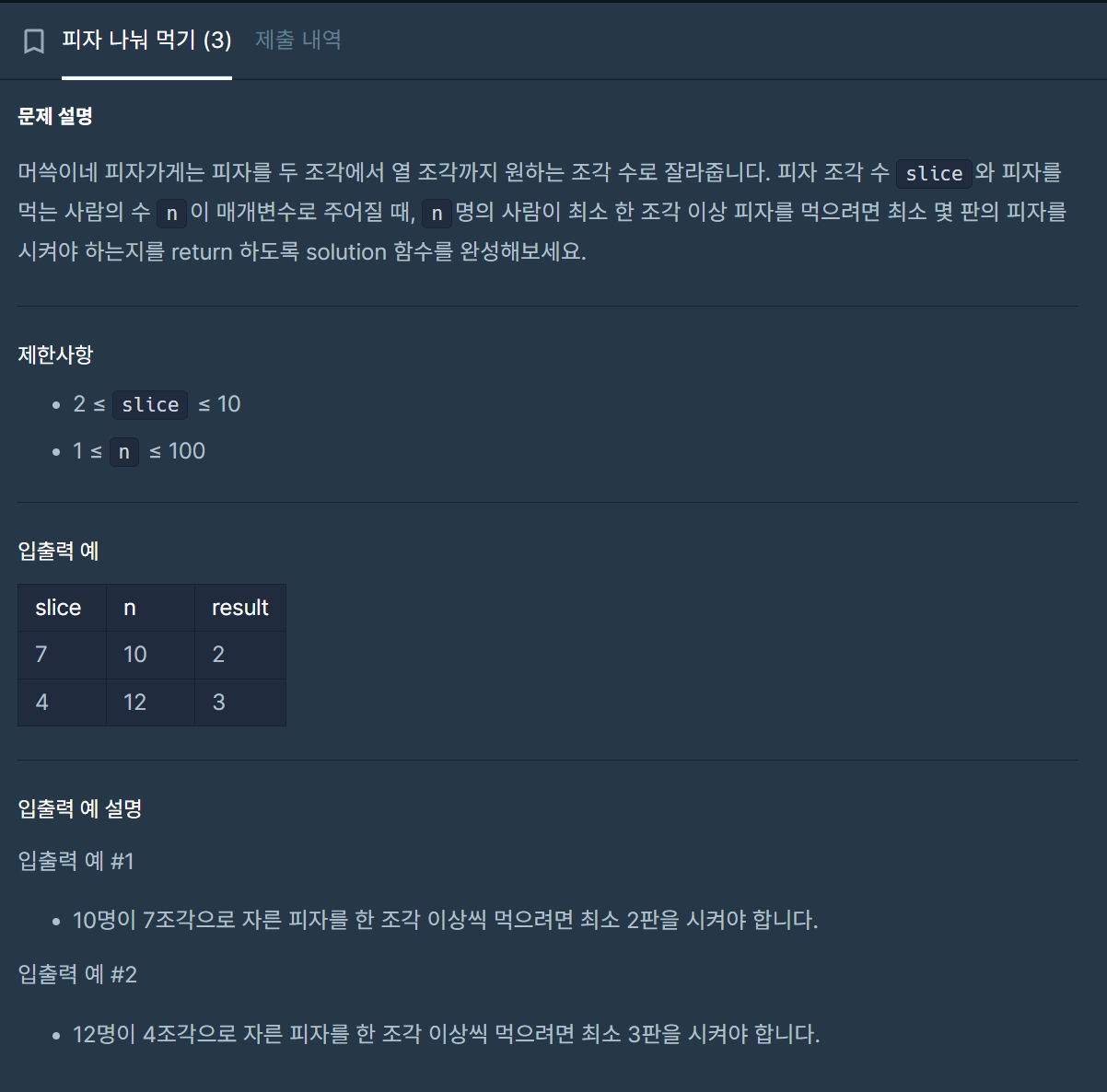 n명이 있고, 한 판에 slice 조각이 있다면, 한 사람당 한 조각 이상 먹으려면 n조각 이상 필요함, 그럼 몇 판을 시켜야 할까?