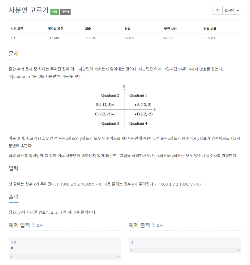점 (x, y)의 사분면 번호(1, 2, 3, 4 중 하나)를 출력한다.