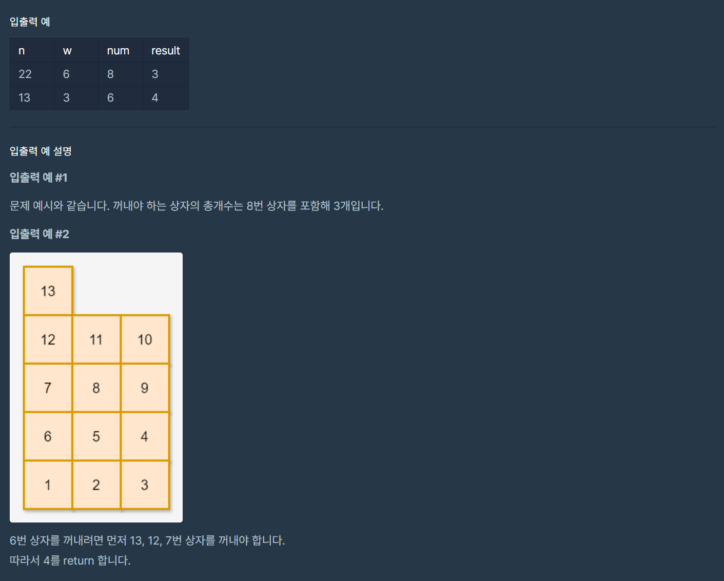 → 현재 상자가 그 층에서 몇 번째 칸인지(0부터 센 위치) - (w - ((num - 1) % w) - 1)